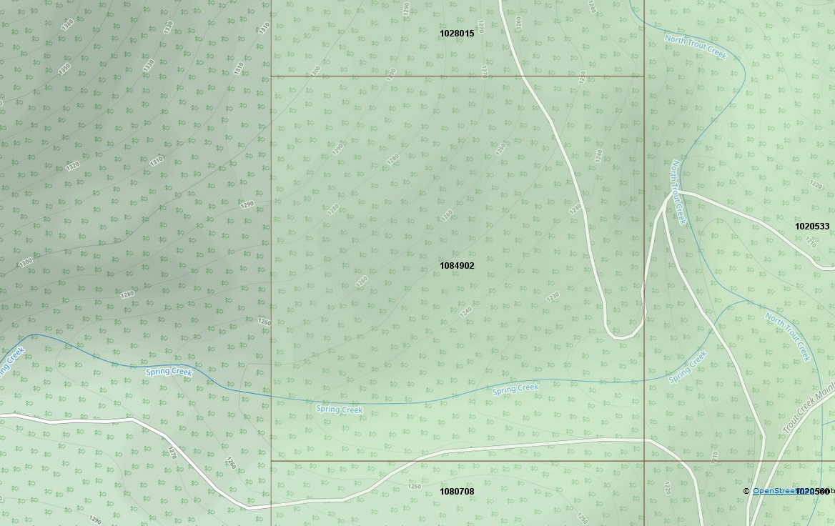 20.86 hectares / 51.54 acres. The property consists of BC Placer Tenure 1072667. From Summerland, proceed west on Princteton-Summerland Rd. for approx 52 km., to Trout Creek FSR. Proceed north on Trout Creek FSR for approx. 12 km. To the west are 2 forest service roads that intersect the property after approx. 200 metres, by the confluence of North Trout and Spring Creek. The property covers approx. 500 metres of frontage on both sides of spring creek, and an outwash area on the west side of North Trout Creek. The property is roughly equidistant between the towns of Princeton, Summerland and Peachland. The claim corners in UTM are: